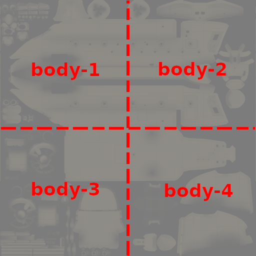 The CH-47 paint is intended to be created as a 2048x2048 texture that gets divided into four 1024x1024 textures for upload to SL. When the textures are placed into an SA paint can (see instructions in paint can for details on how to use it), the textures for the quadrants should be named as shown in Figure 1.