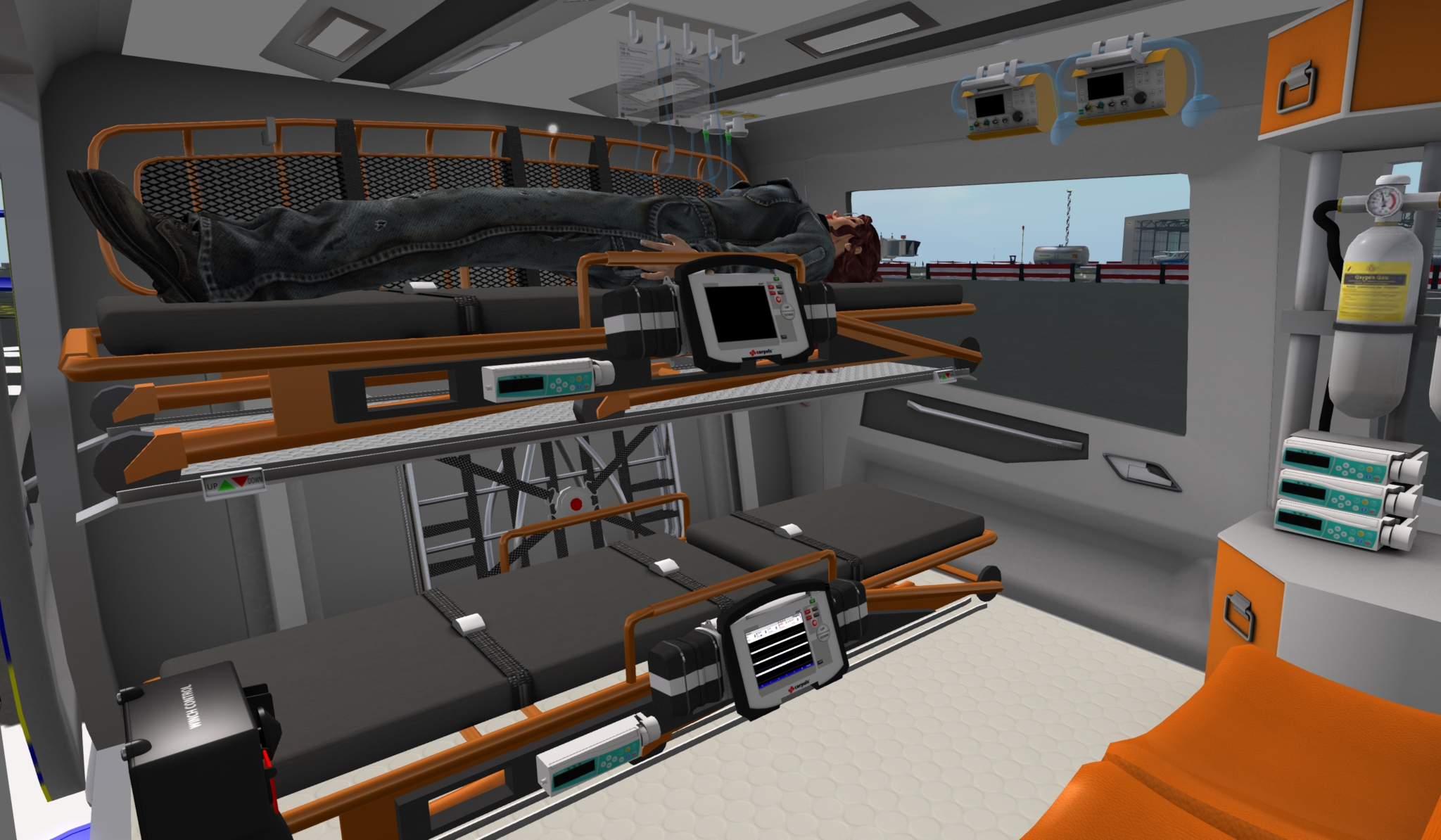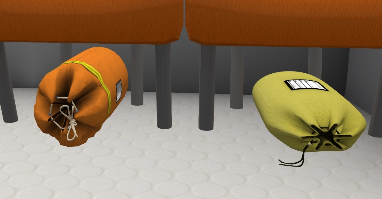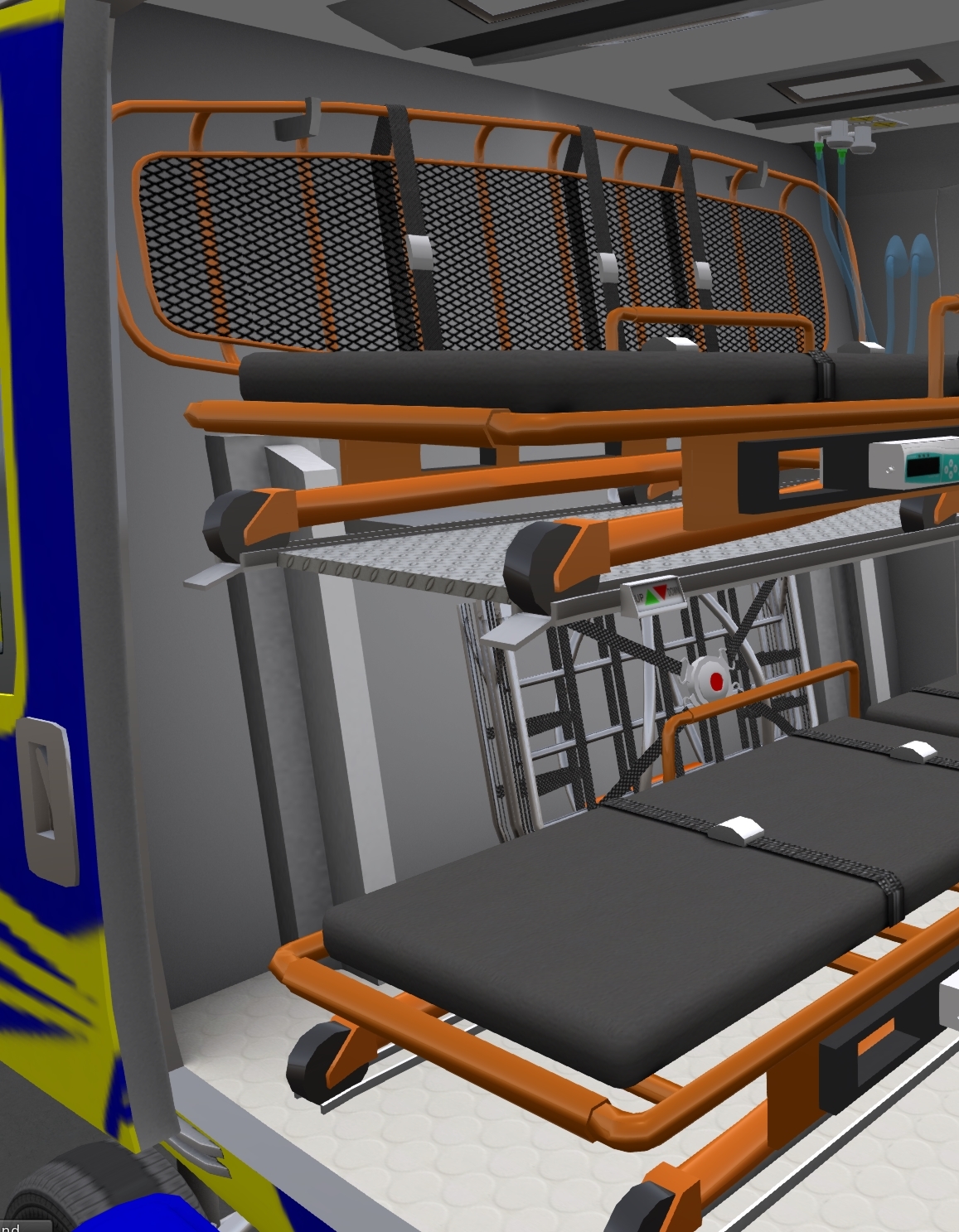 To use a piece of rescue equipment with the winch, click on the item stowed in the cabin. The rescue basket and stokes basket are stored behind the stretchers on the bottom and top, respectively (Figure 6). The rope bag (orange) and harness bag (yellow) are located under the EMS crew seats (Figure 7). Clicking on one items will replace the item currently in use with the exception that the harness and stokes basket may be used together. To stow all rescue equipment, click on the winch hook. Rescue equipment can only be deployed or stowed when the winch has been lower no more than 1.5m.