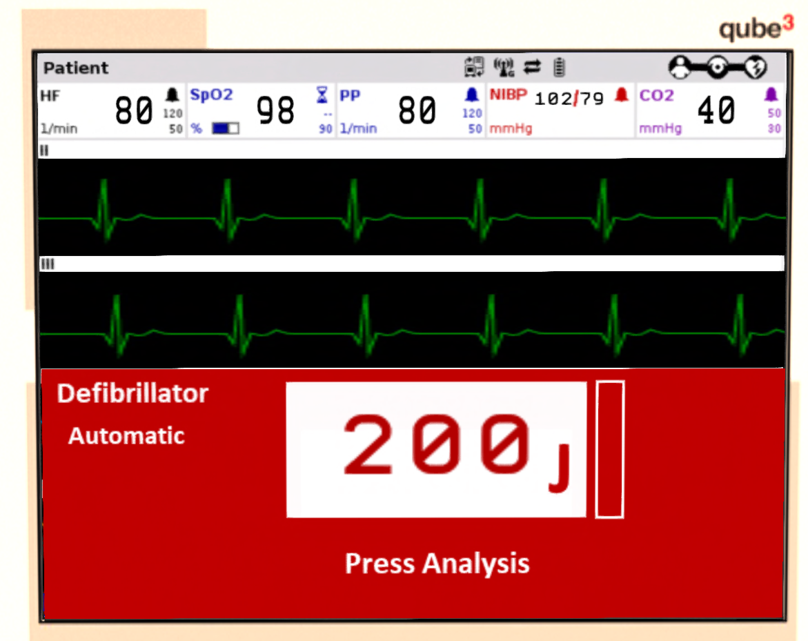 - Fibrillation - A fibrillation heart rhythm will show on the monitor. Applying a shock may return the heart rhythm to normal.