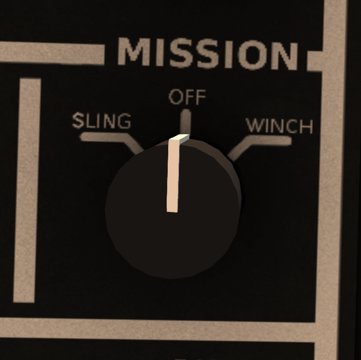 The EMS H160 is equipped with an eclectically operated rescue winch mounted over the right main cabin door. To use the system, first ensure that primary electric power is on, then set the MISSION switch (Figure 5) to the WINCH position. For best results, it is recommended that you keep the MISSION switch in the OFF position except when actively using the winch. Turn the winch off disabled the winch script which improves region crossing and reduces script load. When the winch is turned on, the winch systems will take a few moments to power on followed by the winch arm extending. Once the arm is fully extended, the system is ready for use. Turning the system off will cause the arm to retract.