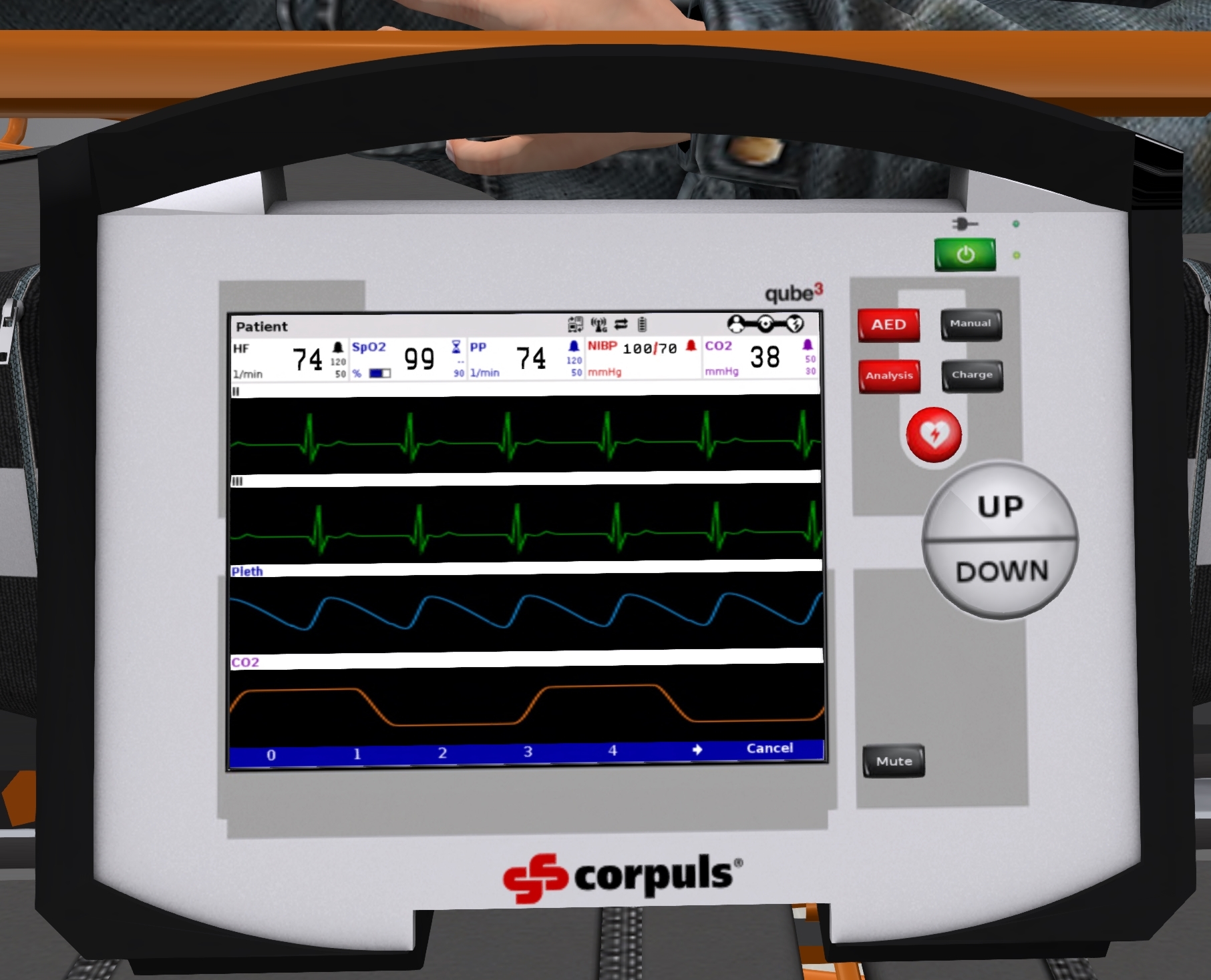 The cardiac health of each patient can be controlled through the stretcher menu. Click on a stretcher to bring up the stretcher menu. Click on the "Health" button to select the current patient health which is reflected through the behavior of the cardiac monitor. The possible health states are: