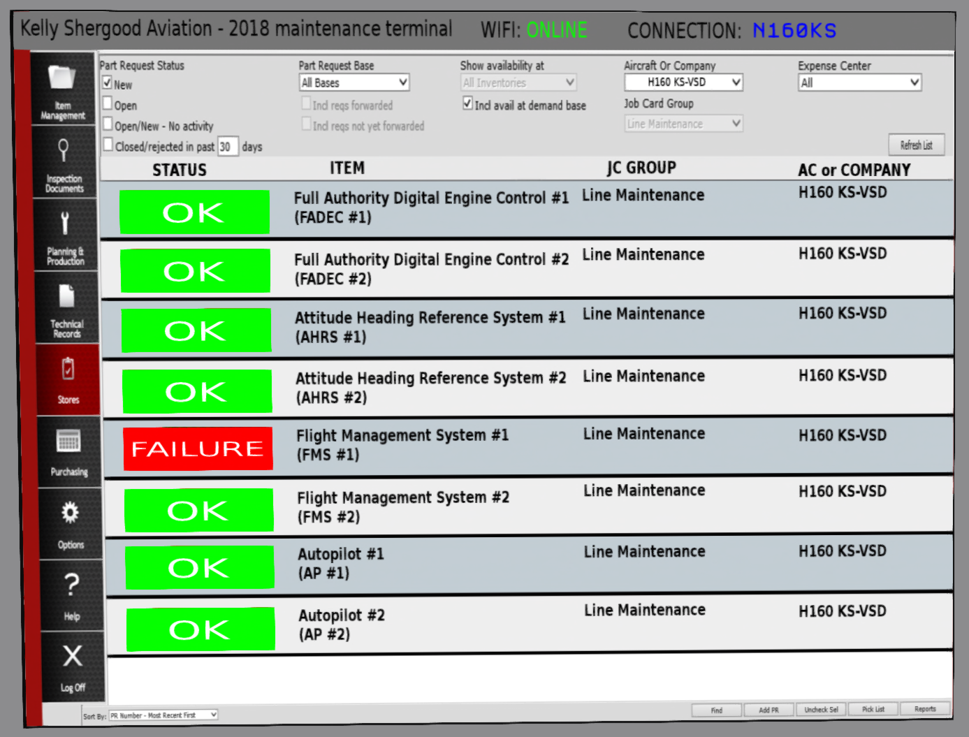 The screen will show a list of the replaceable avionics components. A green "OK" will be shown if the unit is working properly, or a red "FAILURE" will be shown if a fault is detected in a unit. You can also click on a unit name to rerun a test on that unit. If a device is failed, click on that line to send a request to the manufacturer for a replacement, and install the new unit.