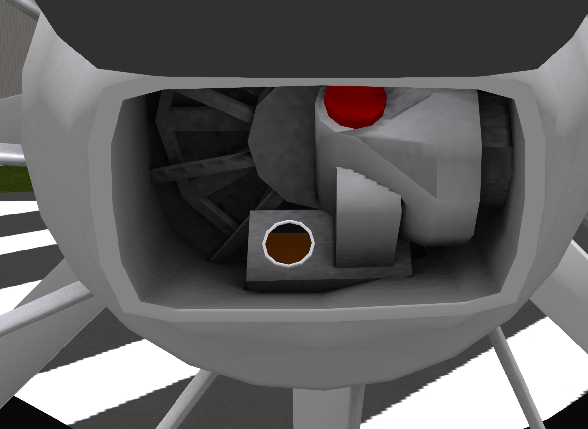 The engines (see Figure 3) are located on either side below and just aft of the main rotor transmission. The engine on left side when looking forward is the #1 engine, and the engine on the right side is the #2 engine. Each engine has a cowling that can be opened for access to the internals. Click on an engine to check for damage, or repair any existing damage. Each engine has an 8 quart oil reservoir. Engines should not be operated with less than 6 quarts. The oil level can be checked with a sightglass below the filler. Click on the red cap to add a quart of oil to an engine.