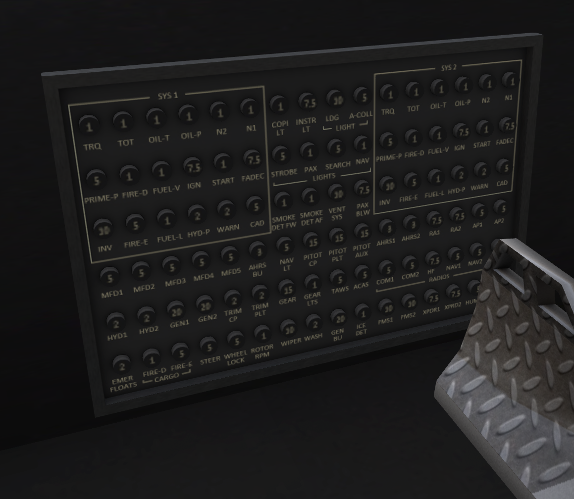 The DC Buses can be examined by clicking on the breaker panel (see Figure 8) located near the floor of the aircraft on the pilot side. Clicking will check for DC bus shorts, and repair the shorts if they are detected.