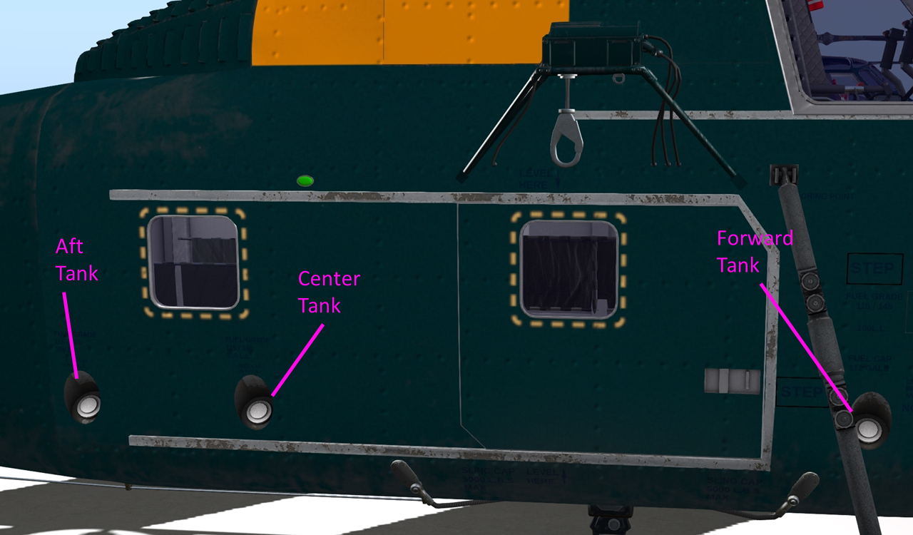 The S-58 is designed to operate on 115/45 grade avgas. In the event that 115/45 is unavailable, a supplementary type certificate has been issued to allow unlimited use of 100LL avgas. The use of any other fuels is unsafe and STRICTLY prohibited. When refueling with KellyFuel 3.0 or later, care must be taken to use the correct fuel type. If the incorrect fuel type is used, the fuel in that tank will be tainted, and operating the engine with tainted fuel will cause engine damage and potentially failure. If a tank is accidentally filled with the wrong type of fuel, the tank must be completely emptied to flush it of all contaminant. The tanks can be flushed through the @Cheat menus by setting the fuel amount to 0.