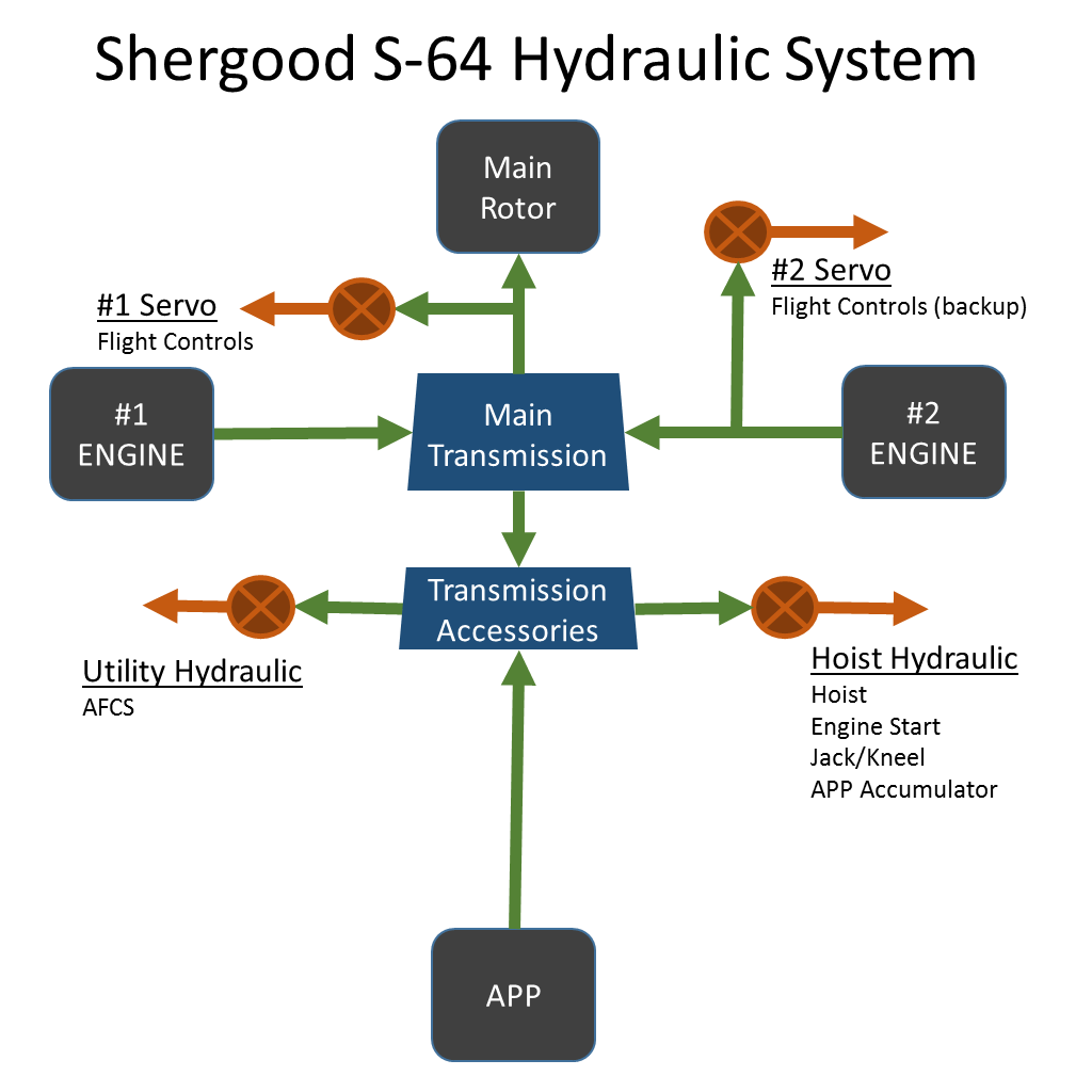 This aircraft utilizes four hydraulic systems: #1 Servo, #2 Servo, Utility Hydraulic and Hoist Hydraulic. The utility and hoist hydraulic systems are powered by the main transmission accessories stage and powered through either engine or the APP. The #1 Servo system is powered by the main rotor and is active when main rotor is turning. The #2 servo is powered directly by the #2 engine. Each system has its on pressure indicators and warning lights.